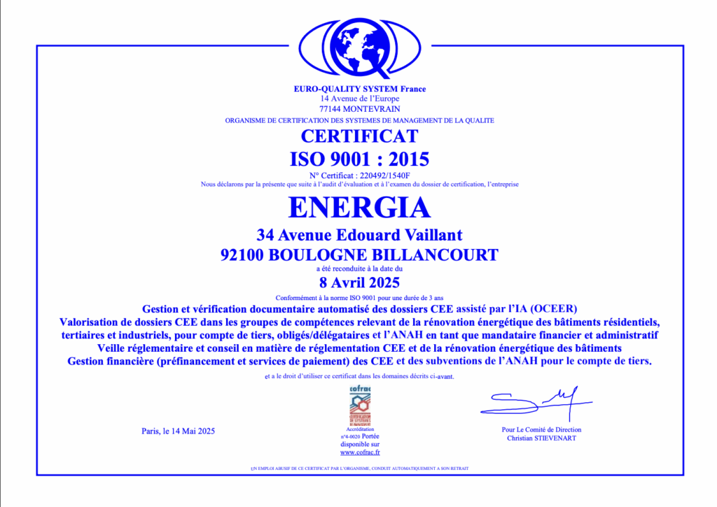 À ce titre, ENERGIA accompagne ses clients dans la conformité, dans le contrôle documentaire et la vérification réglementaire de leurs dossiers.